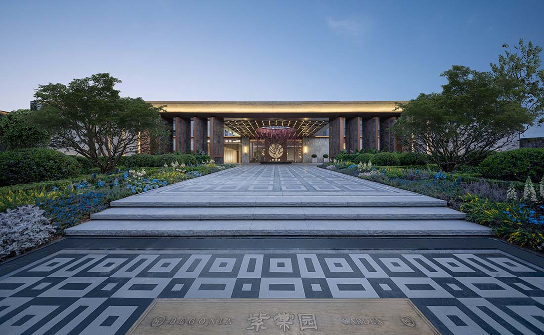 項目在整體規(guī)劃布局上采用中軸對稱的經(jīng)典形制,南北向規(guī)劃約196米大氣恢弘的尊貴禮序感的中軸,入口通過酒店式落客區(qū)進入內(nèi)庭院,鏈接歸家大堂步入園區(qū)。園區(qū)中軸線上分別布局了中心花園、中央泳池及水岸觀景臺,形成中軸六境;東西軸線則按照運動活力與靜謐舒緩兩大主題進行功能排布,整體打造“紫棠十二境”,構(gòu)建金沙湖畔新一代度假人居生活樣本。